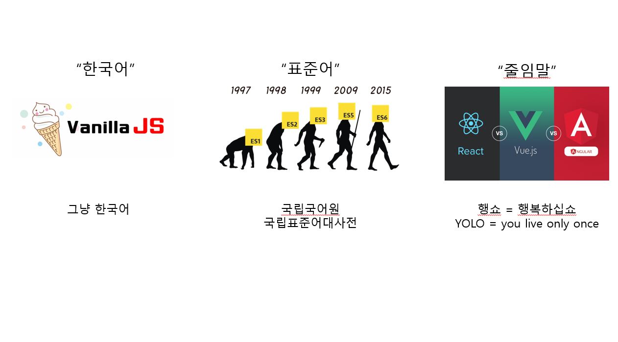한국어로 말을 하다보면, 긴 내용을 축약해서 말하고 싶어진다. 그러면 형태는 이전과 달라지지만, 훨씬 짧은 단어로 많은 의미를 내포할 수 있게 된다. 바로 그 역할을 하는 것이, React, Angular, Vue이다. 여기에 있는 기능들은 Vanilla JS로 구현할 수 있지만, 이전보다 쉽게 구현을 위해 줄임말 역할을 하는 것이다.