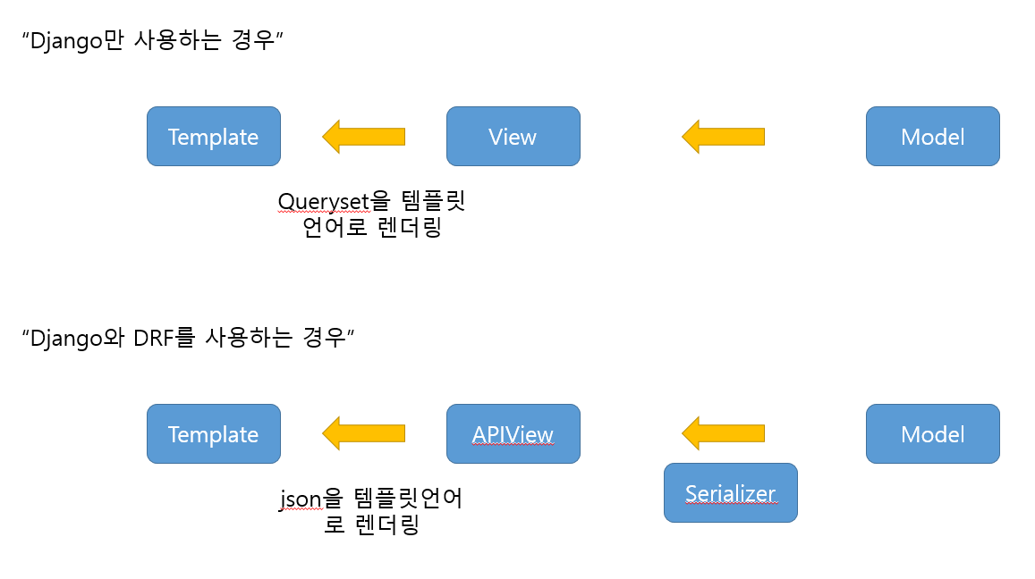 이 때 Django와 함께 사용되는 것이 DRF이다. rest_framework를 사용하게 되면, view와 model 사이에 serializer라는 것을 사용하게 된다. View에서 Serializer를 가져와서 사용하게 되면 Model에서 꺼낸 데이터를 Queryset의 형태가 아니라 json형태로 데이터를 받아올 수 있다.
