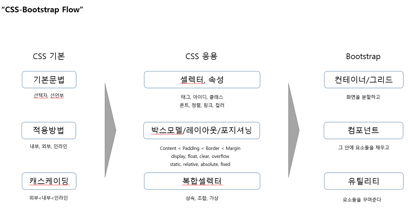 이렇게 CSS를 사용해서 화면을 구성하게 되는데, CSS나 Bootstrap이나 기본적인 Flow는 동일하다.