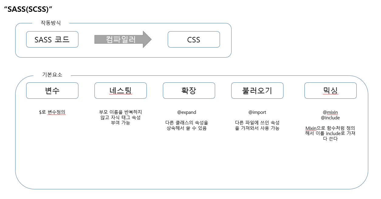 SASS를 사용하게 되면, 다른 언어를 사용할 때와 마찬가지로 변수, 함수가 존재한다. $로 변수를 정의하고, mixin과 include로 함수를 정의해서 사용하면 된다. 이 때 다른 클래스의 속성을 expand로 상속해서 사용할 수도 있고, 다른 파일에서 쓰인 속성을 import해서 사용할 수 있다. 추가적으로 Nesting이라는 개념이 존재하는데, 기존에는 자식 태그의 속성을 정의하기 위해 부모 속성까지 같이 적어서 정의했다면, 이제는 중괄호 내에 들여쓰기로 속성을 정의할 수 있다.