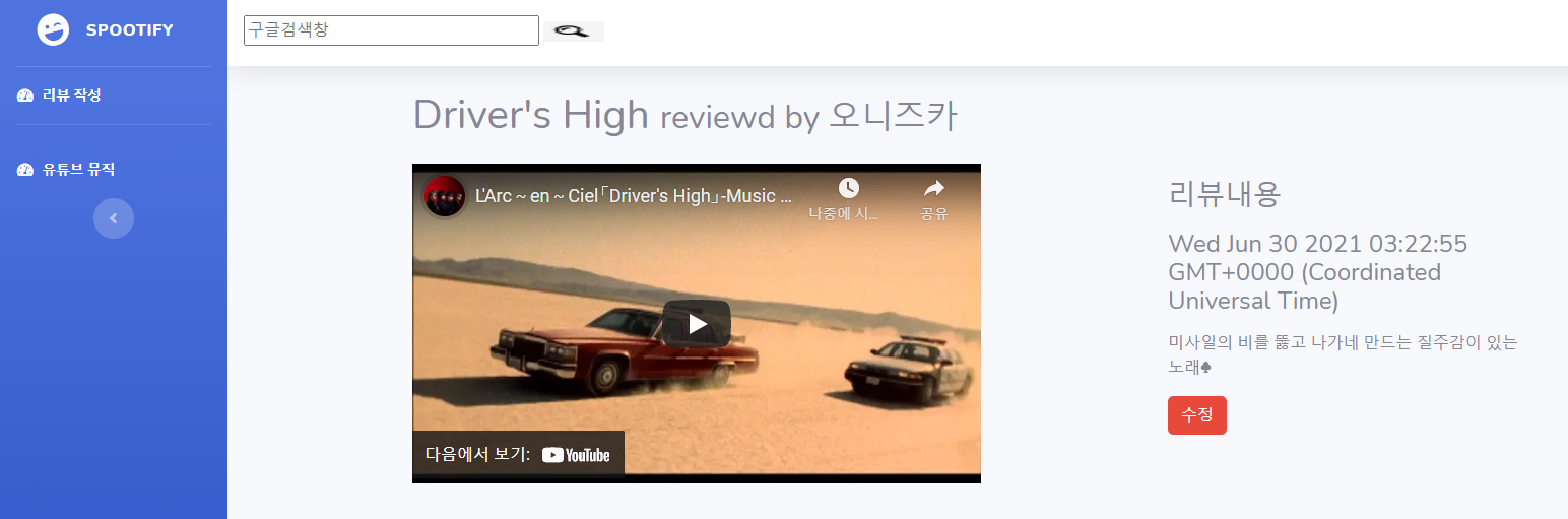 Node.js환경에서 Express프레임워크와 MongoDB를 활용하여 간단한 곡 리뷰사이트를 만들었다. 프론트엔드는 bootstrap으로 만들어진 템플릿을 사용하였고, 글 수정, 작성, 삭제버튼에 대해서는 jQuery를 이용해 ajax통신으로 구현하였다.