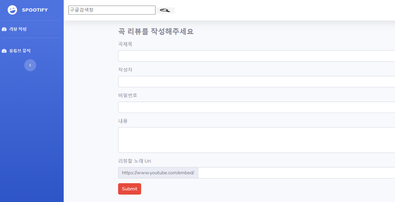 왼쪽 탭의 리뷰작성 버튼을 누르면 리뷰를 작성할 수 있는 페이지로 이동하게 된다.
