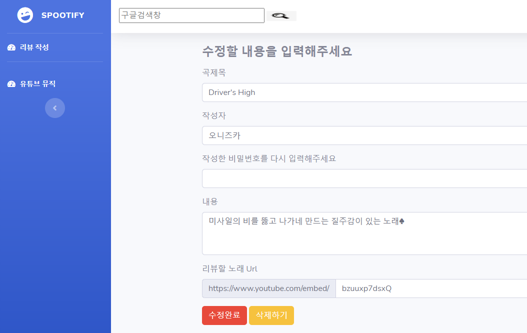 삭제버튼을 누르면 작성한 리뷰가 삭제되도록 한다.